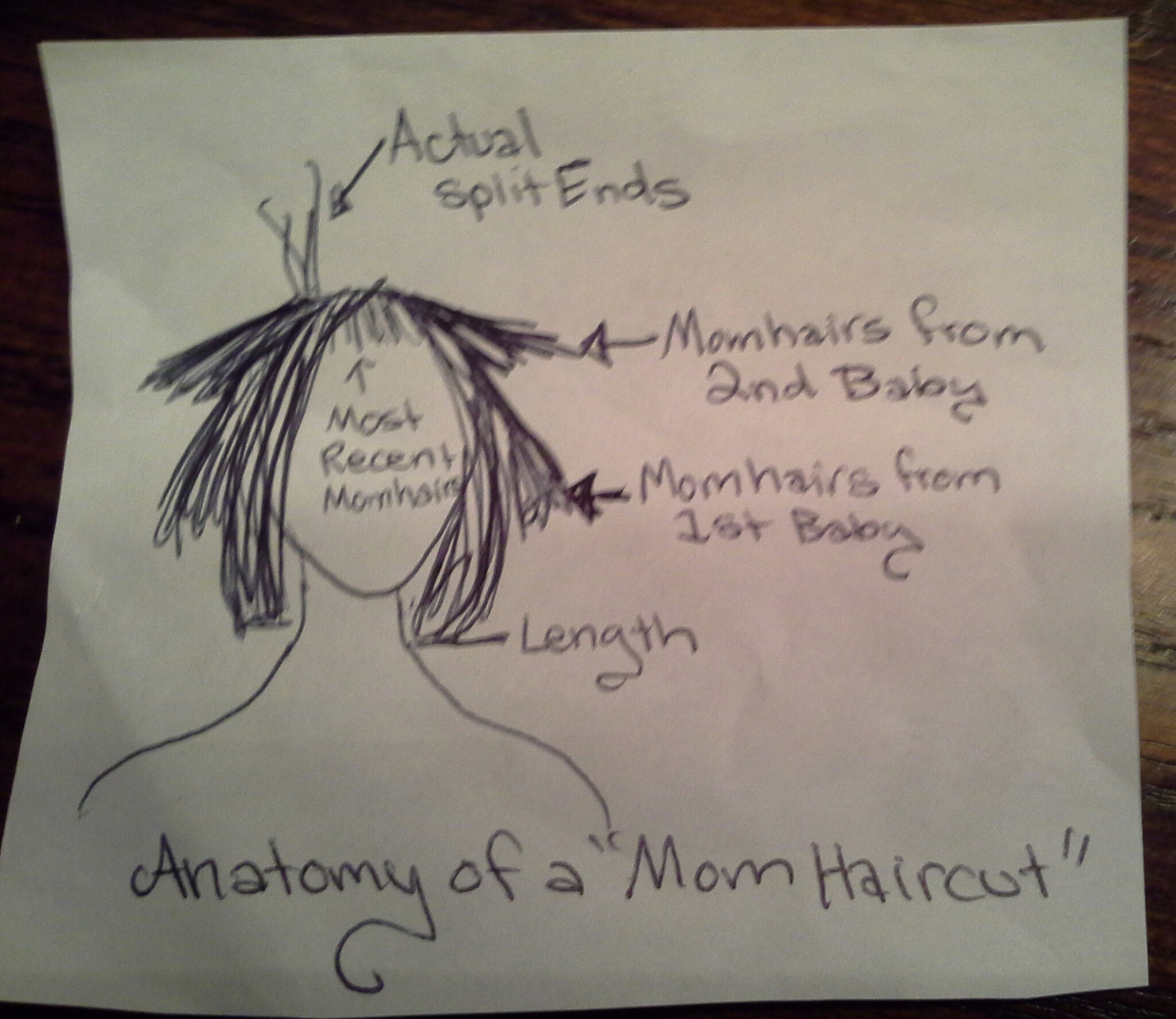 Mom hairs aren’t discussed very much, but “mom hair” is. This refers to the shorter, layered coif that one adopts after becoming a mother. Society recognizes this and believes that the reason for this haircut is because babies pull on your hair or that it is easier to maintain while your world is in blissful disaster. Those sound just believable enough, but that isn’t the real reason for mom hair. The real reason for this hairstyle is that through the magic of mom hairs, it is self-producting. Observe, the explanatory sketch I have drawn on what would have been a perfectly good piece of printer paper were it not found wrinkled under the kitchen table.