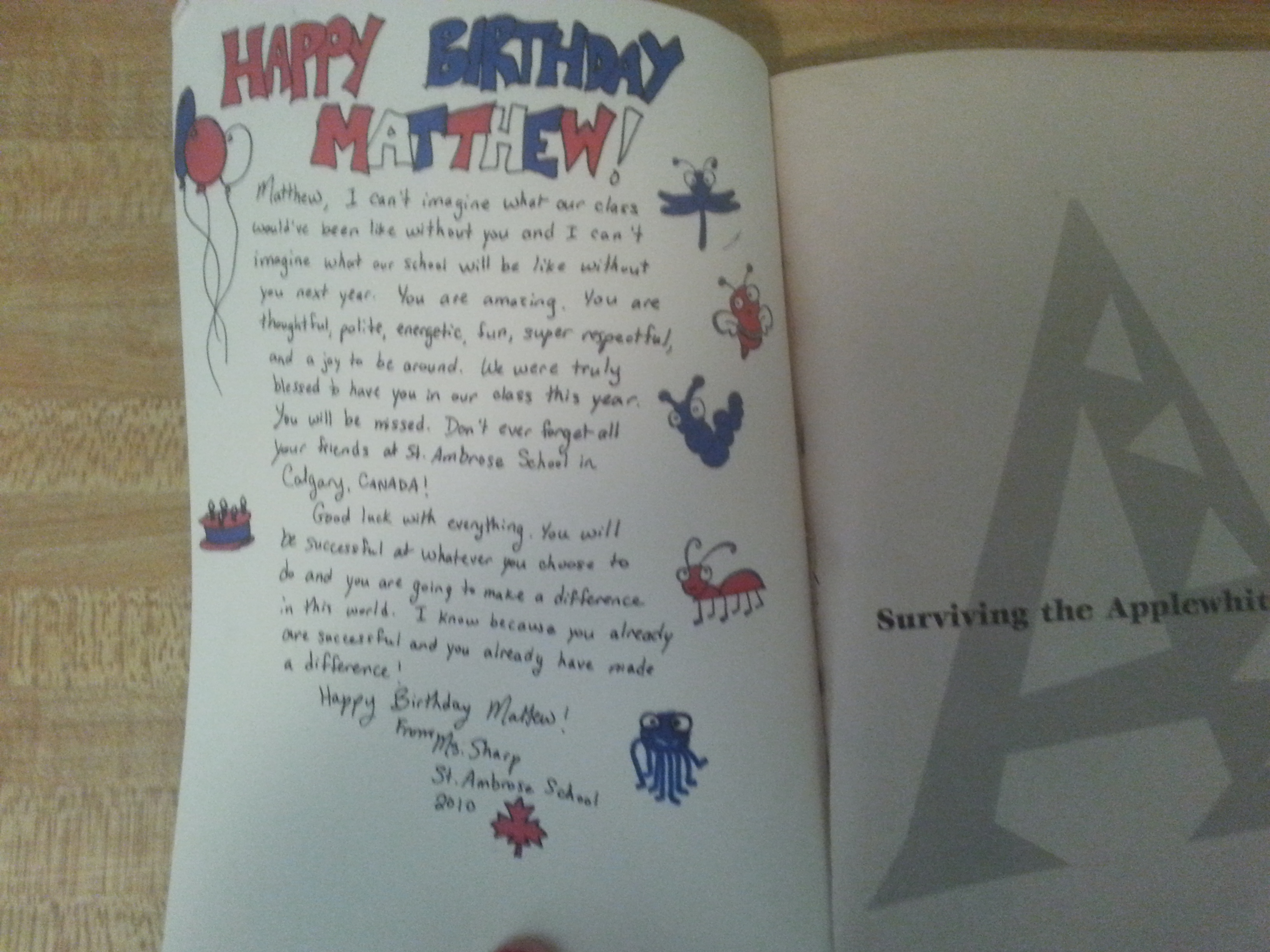 As the summer is drawing to an end, I find myself coding and leveling all of the new(ish) books for my classroom library. I come across a lot of inscriptions, occasionally from teacher to student, but this one made me a little bit sad. This birthday letter is not just long and thoughtful, it is hand-written, personalized, illustrated and colored. Somewhere in Canada (note that this book made it all the way to a thrift store in Texas) is a teacher who like most of us, really loves her students. I don’t know how many students she had in 2010, but she put in a lot of time on this only for it to be discarded less than 4 years later. This along with some of the completely insane classroom birthday ideas I have seen on pinterest have me thinking. There are good reasons not to go over the top for student birthdays.